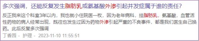 我说我不会再去换药,护理不到位,谁挂外渗的谁去换。科室争议很大,说我不开这条医嘱就不会外渗,这还能全怪上我了。多次强调,还能反复发生脂肪乳或氨基酸外渗,引起并发症属于谁的责任?