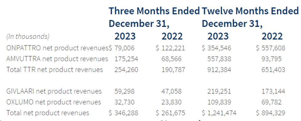 2019年11月,FDA批准givosiran上市,用于治疗成人急性肝卟啉症(AHP)。截至2023年底,全球有超过650名患者正在接受商业化Givlaari治疗,超过430名患者正在接受商业化Oxlumo治疗。