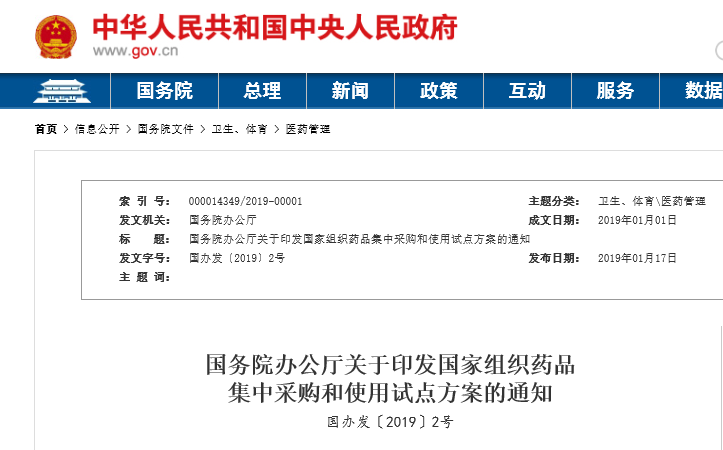 2018年11月15日,国务院办公厅印发的《国家组织药品集中采购和使用试点方案》提出:选择北京、天津、上海、重庆、沈阳、大连、厦门、广州、深圳、成都、西安11个城市遴选试点品种,国家组织药品集中采购和使用试点,实现药价明显降低,减轻患者药费负担。