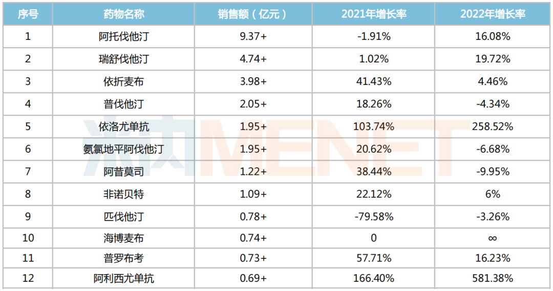 3月25日,由国家心血管病专家委员会联合中华医学会心血管病学分会、内分泌学分会、糖尿病学分会、检验医学分会和中国卒中学会组成的中国血脂管理指南修订联合专家委员会修订的《中国血脂管理指南(2023)》(以下简称指南)正式发布。指南中明确,儿童青少年脂质异常血症发生率已高达20.3%~28.5%,在洋快餐及反式脂肪酸摄入量过多的影响下,高脂血症已呈现逐年上升趋势。在中国普通居民血脂指数逐年升高的情况下,我国现有心血管病患人数或将增长至3.3亿人。对此,国家卫健委在制度层面应予以足够重视,规范就医用药已是迫在眉睫。米内网数据显示,2018年中国城市公立医院、县级公立医院、城市社区中心以及乡镇卫生院(简称中国公立医疗机构)终端血脂调节剂销售规模超过260亿元,同比增长17.24%。在国家集采的推动下,近两年他汀类药物价格的跳水,销售市场萎缩,而伴随市场发展的刚需,2022年该类药物已有复苏的趋势。2022年重点省市公立医院终端血脂调节剂品种TOP12中,他汀类前5大品种市场份额整体回升,包括阿托伐他汀、瑞舒伐他汀、普伐他汀、氨氯地平阿伐他汀及匹伐他汀。其中,领军品种阿托伐他汀销售增长超过16%,位居第二的瑞舒伐他汀销售增长超过19%。2022年重点省市公立医院终端血脂调节剂品种TOP12来源:米内网重点省市公立医院药品终端竞争格局