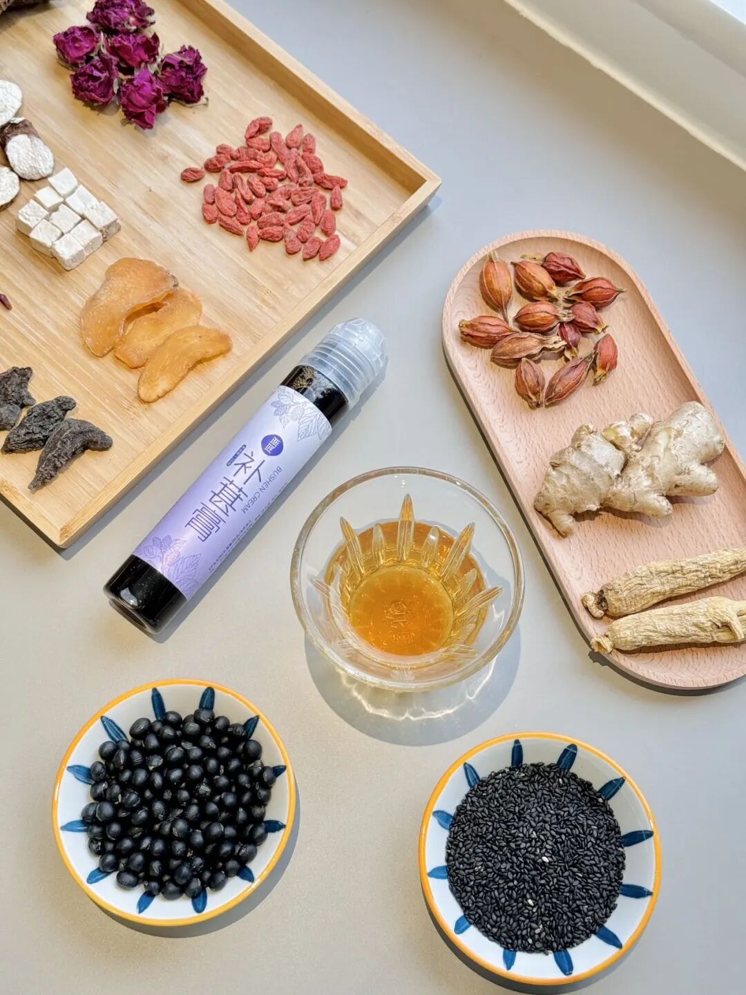 桑葚、黑芝麻、黑豆、何首乌、玫瑰花、西洋参、黄精、黑枣、百合、佛手、栀子、怀山药、怀姜、桂圆、肉苁蓉、肉桂、茯苓、芡实、枸杞。