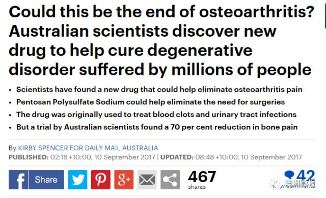 说来也奇,含有这种名为木聚硫钠(Pentosan Polysulfate Sodium)的药物早在数十年前就已投入市场,但主要疗效是治疗血栓和女性尿道感染;经历了数年的研究之后,澳洲医学科学家们却发现,这一药物还有用于治疗缓解关节炎的用途!