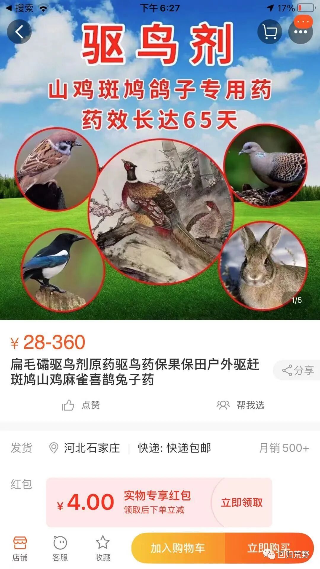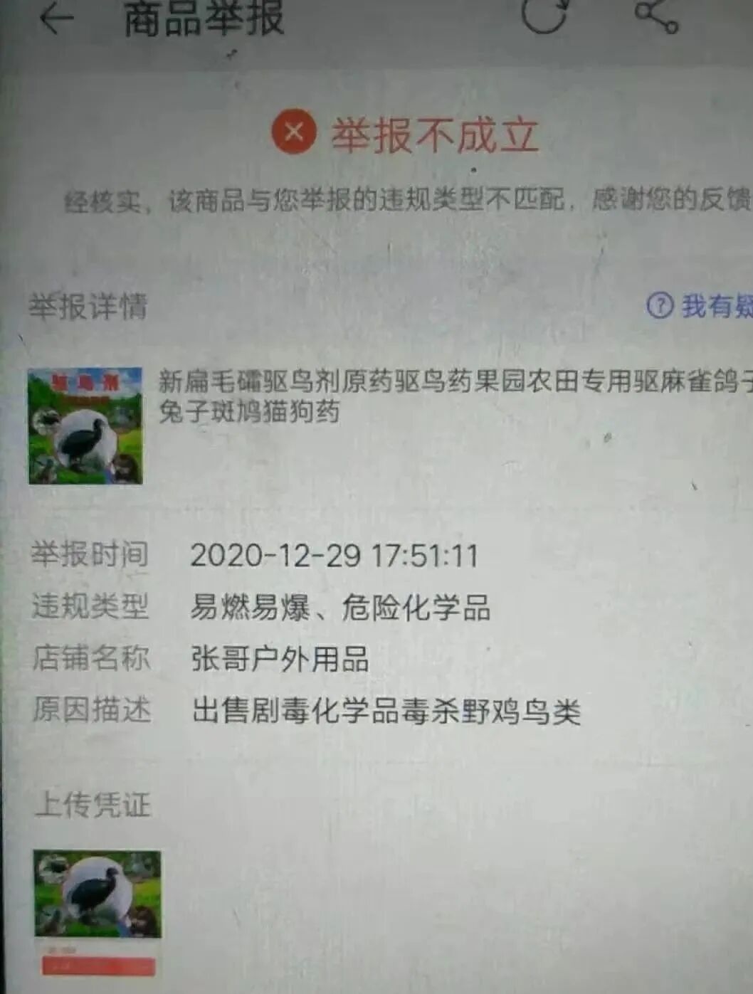 近日,有电商无野行动志愿者发现在淘宝平台有不少商家在卖毒鸟药扁毛礵,也就是克百威,也是呋喃丹,对鸟类野生动物危害非常大。我们发现这些商家在广告里有药山鸡、药斑鸠、药野兔、药喜鹊等关于野生动物的字样。我们的志愿者在淘宝平台做了商品违规举报,但是所有的结果都是举报不成立。