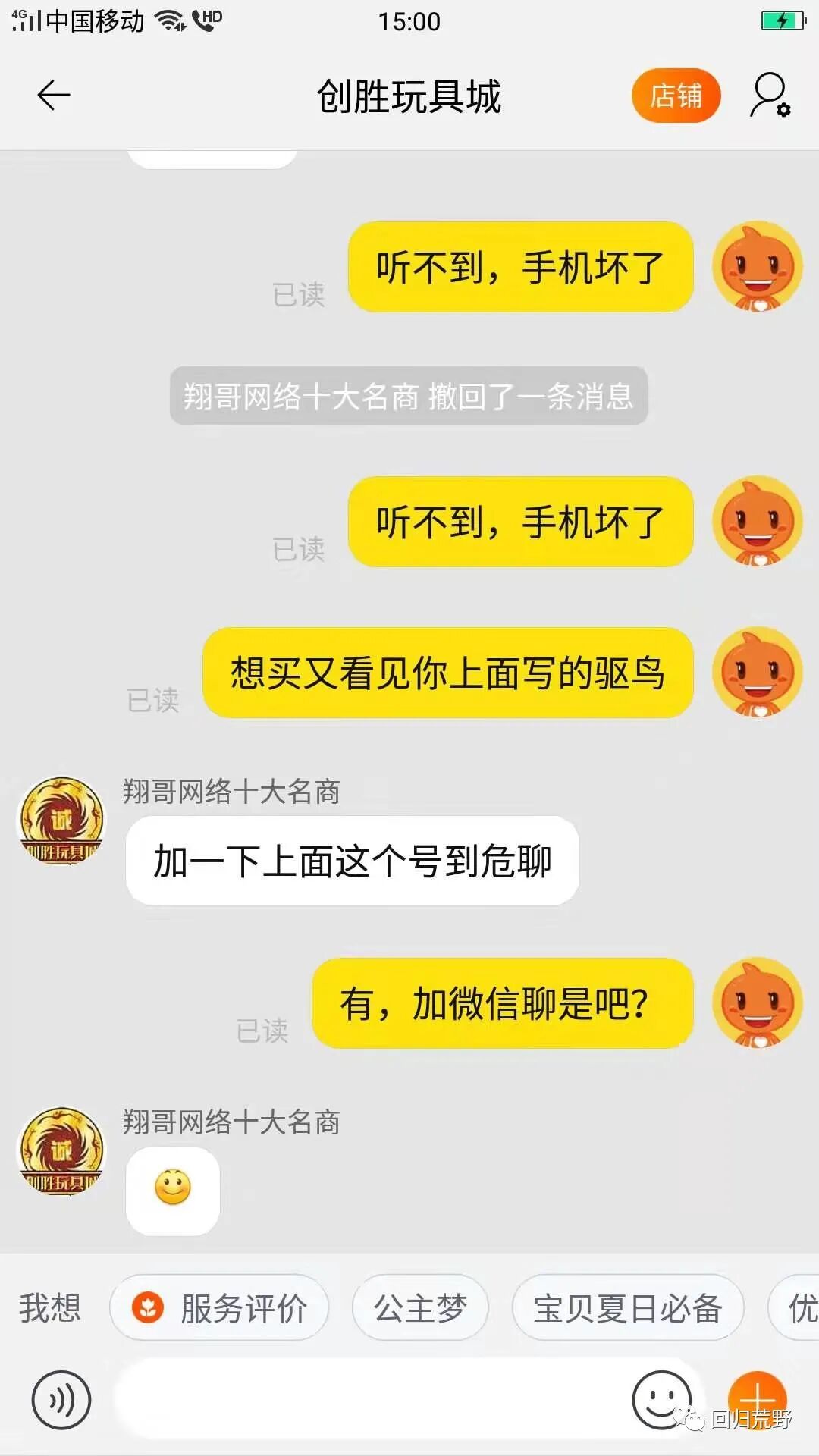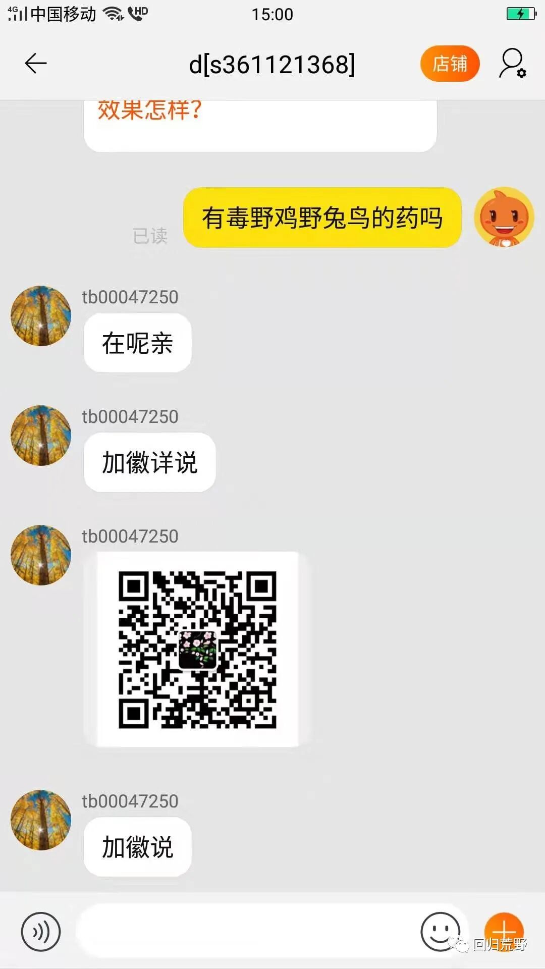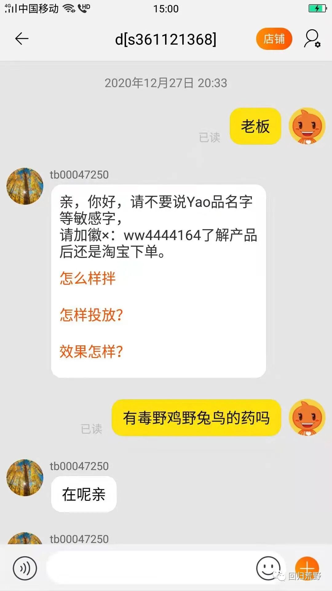 上面是我们的志愿者和卖家咨询毒鸟药的情况,店家客服都比较敏感,都是加微信聊。我们大概有十多个和店家的聊天记录,可以看出这些店家都有毒鸟药在售卖。