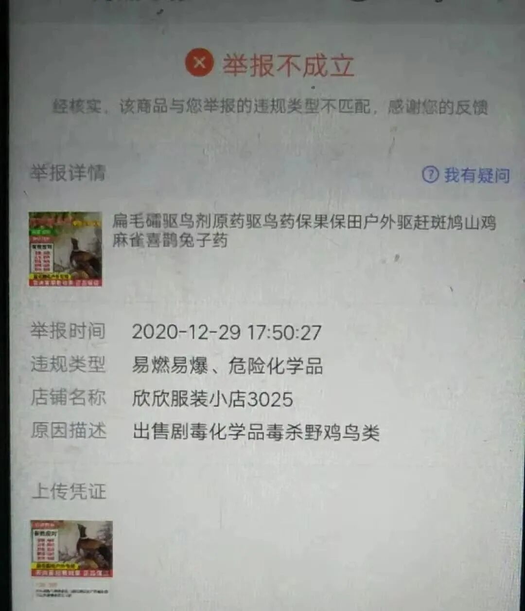 如上二图,是我们志愿者在淘宝网上举报20多个商家售卖毒鸟药的情况,无一例外,所有的举报都不成立。