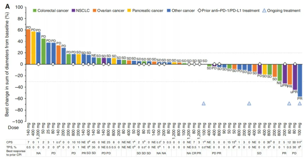 这个双抗,近期在《cancer discovery》杂志公布了一项小2期临床试验的结果,一共有61例其他标准治疗失败的晚期难治性实体瘤患者入组,其中包括20%的肠癌患者,15%的卵巢癌患者,10%的胰腺癌患者,10%的肺癌患者,其中23人既往已经接受过PD-1/PD-L1免疫治疗,入组临床试验后,一开始是剂量爬坡,后续是在一个合适的剂量中开展初步疗效的探索(也就是说并非所有患者都接受到了足够浓度的药物治疗),最终所有患者的疾病控制率为65.6%,有4例患者肿瘤明显缩小(其中2人是既往接受过PD1免疫治疗失败后入组的),应该来说还是值得进一步探索的。