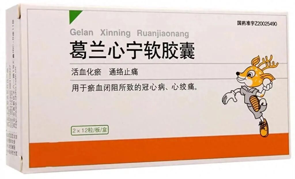 葛兰心宁软胶囊,由葛根总黄酮、山楂提取物、绞股蓝总皂苷组成。活血化瘀,通络止痛。用于瘀血闭阻所致的冠心病、心绞痛。