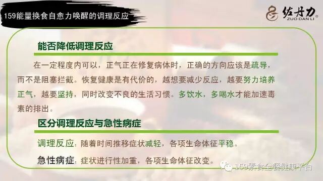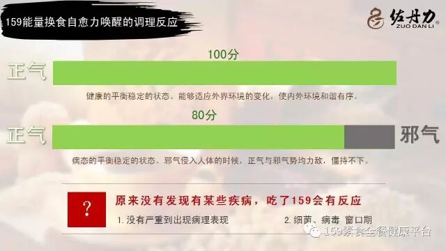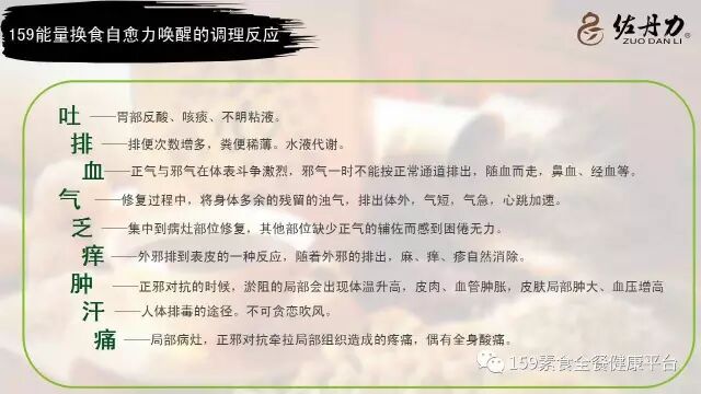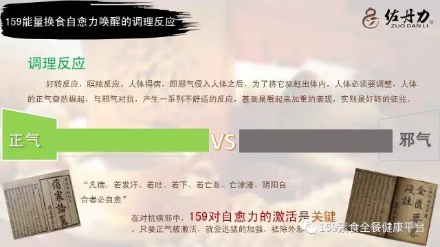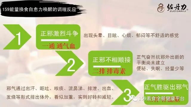 而我们食用了159进行了饮食滋养之后,你的正气旺盛了,那机体自然就会产生一个排毒的反映,那要想把毒素排出体外,就需要我们有一个正确的心态去面对,在正气升腾的过程当中调节机体去自然的抗病之后,会出现的各种暝眩反应。