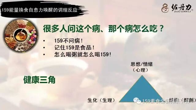 在换食159的时候,应该关注的是我们自己与身体之间的对话,去关注身体每个器官的改善,去接受好的呈现,也接受不好的作用力反应,因为159是大自然的产物,顺应道法自然的食物与人相融,只会更健康……