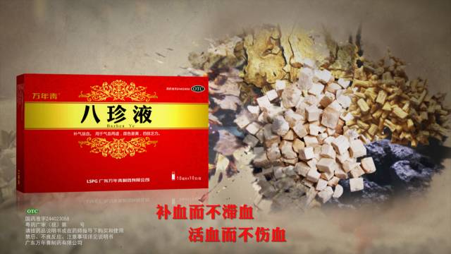 八珍汤由人参、白术、茯苓、当归、川芎、白芍、熟地、炙甘草八味药材组成,并以生姜、红枣为引。其中,党参、白术、茯苓、甘草四味即四君子汤,为天下补气第一名方;方中当归、熟地黄、白芍、川芎四味即四物汤,为补血活血调经千古妇科圣方,养血滋阴佳品,是现代人补气益血的最佳选择。为提高疗效和方便服用,万年青采取蒸酒提纯的制作方法,并把汤剂改良为口服液剂型,命名为八珍液。