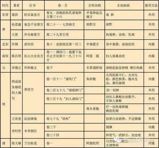 (一) 东晋葛洪所著《肘后备急方》•卷五•治痈疽妒乳诸毒肿方第三十六记载:葛氏,卒毒肿起,急痛方:芜菁根大者削去上皮,熟捣,苦酒和如泥,煮三沸,急搅之出,敷肿帛裹上,……又方,水和石灰封上,又苦酒磨升麻,若青木香或紫檀,以磨敷上,良。