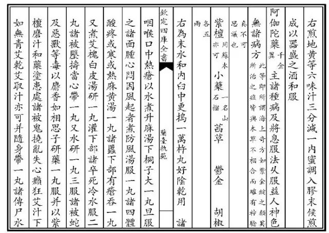 (十)清徐大椿在《兰台轨范》卷一里记载了加入了紫檀的阿伽陀药用于治疗诸疾:阿伽陀药(千金翼)主诸种病及将息服法,久服益人神色,无诸病。此等即所谓海上奇方,如紫金锭之类,其所治之症皆与本草不相合,而确有神验,真不可思议也。