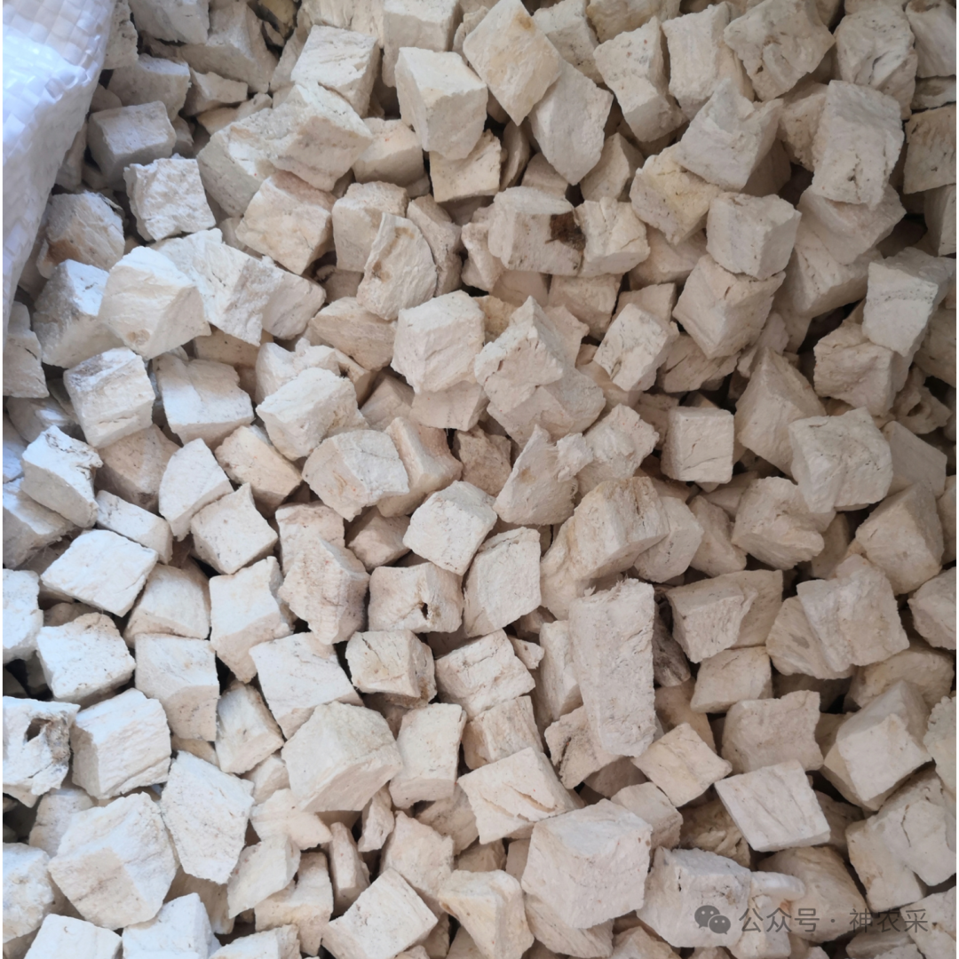 本品呈不规则的厚片或立方块状。外表面黄白色或淡棕色。切面黄白色,横切面有时可见由纤维形成的浅棕色同心性环纹,纵切面可见由纤维形成的数条纵纹。体重,质硬,富粉性。气微,味微甜。