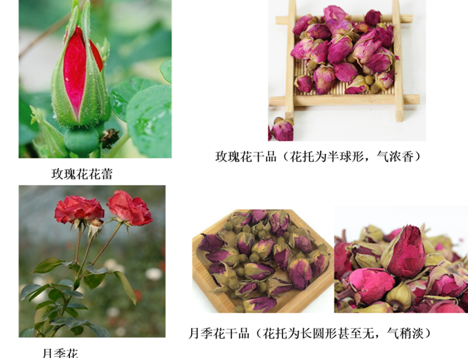 看形状:玫瑰花略呈半球形或不规则团状,直径1-1.5厘米;月季花呈类球形,直径1.5-2.5厘米。