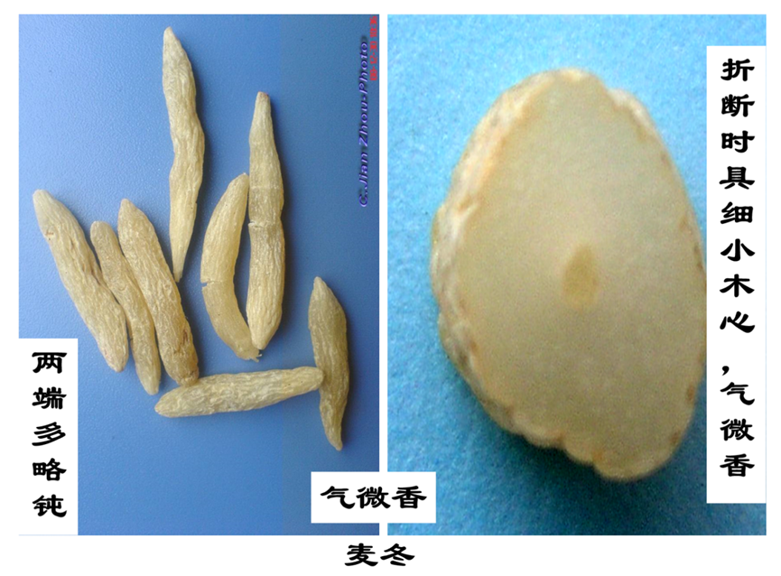 闻气味:麦冬气味微香,甜中带苦味;山麦冬带有微香,甜而不苦。