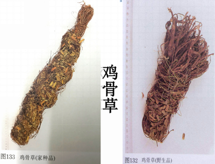 市面上看到的分鸡骨草(野生)、家种鸡骨草和大叶鸡骨草三种。因其根头部稍膨大,成结节状,质地硬如鸡骨,故称鸡骨草,属利水渗湿药的利胆退黄药,主要是利湿退黄,清肝火,治疗黄疸、急慢性肝炎,肝硬化腹水等。而大叶鸡骨草因其小叶比鸡骨草大1/3左右,两面密披柔毛,故习惯称为大叶鸡骨草。野生鸡骨草是传统优质品种、其次为家种鸡骨草,大叶鸡骨草主根细而不结节,茎粗色青有粗毛,习惯认为质次。