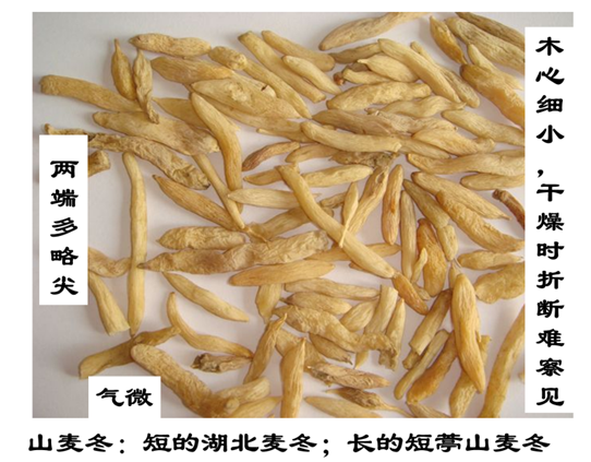 看木心:麦冬木心小,干燥时不易折断或断面不平,有小木心。山麦冬木心微小,干燥后易被折断,断面齐平,无木心。