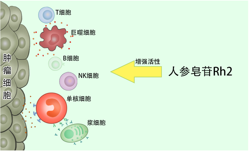 人参皂苷Rh2刺激会引起细胞毒效应分子NO和TNF-α分泌增多,增强肺癌患者肺泡巨噬细胞免疫功能,也能增强体内NK细胞的活性,NK可释放白介素、干扰素等细胞因子,参与免疫杀伤和清除,这些免疫细胞活性的增强能够具有更强的抗肿瘤作用。