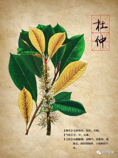 杜仲偏补肾阳,性温,入肝、肾经,具有补肝肾、强筋骨、降血压、安胎等诸多功效,主治腰脊酸疼,风湿痹痛等症状。