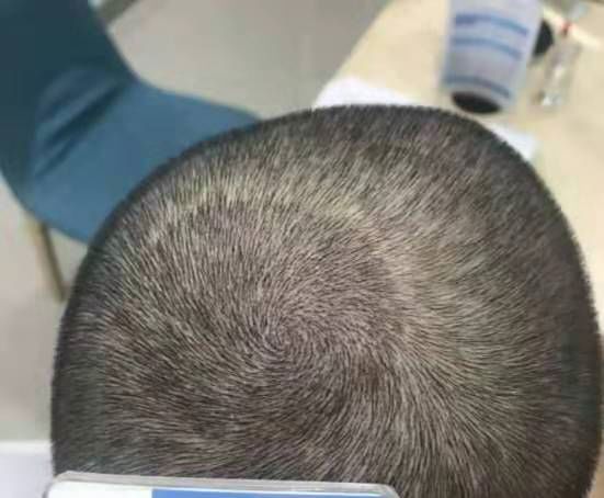 在毛囊单位移植过程中,受区打孔设计规划不善、深度不当、密度不足、打孔角度或方向不正确等因素,可能导致不美观的结果。打孔时根据方向、角度及相互关系,充分理解毛囊的概念和空间至关重要。受区打孔的宽度、深度、角度、方向、密度以及它们之间的关系,将直接影响最终的外观和满意度。理想的孔隙能完整地容纳毛囊单位,合理的分布可达到理想的美容效果。附一张植发发友当天的照片供大家参考。
