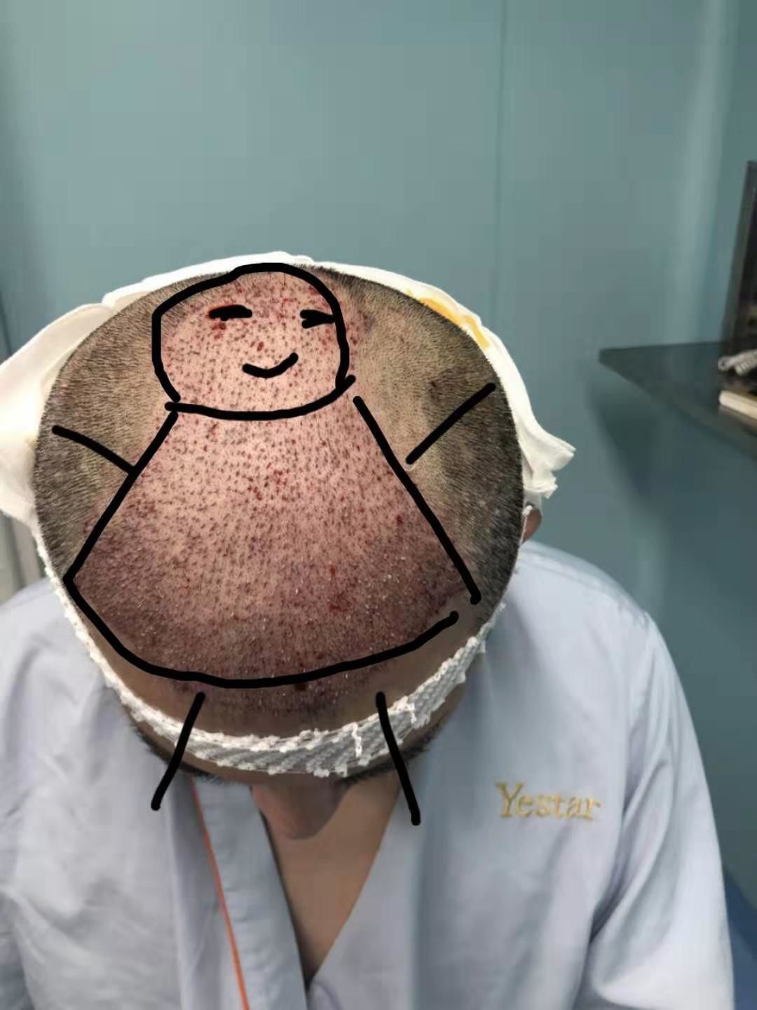 Tips:术后第一天睡觉需要注意,因为后脑采集区包裹了绷带,仰卧头部无法完全支撑在枕头上,比较痛苦。睡觉的时候注意在枕头上垫一块毛巾,因为头上还是会有药膏啊,液体啊会粘在头发上,量也不大。睡姿怎么样都不疼