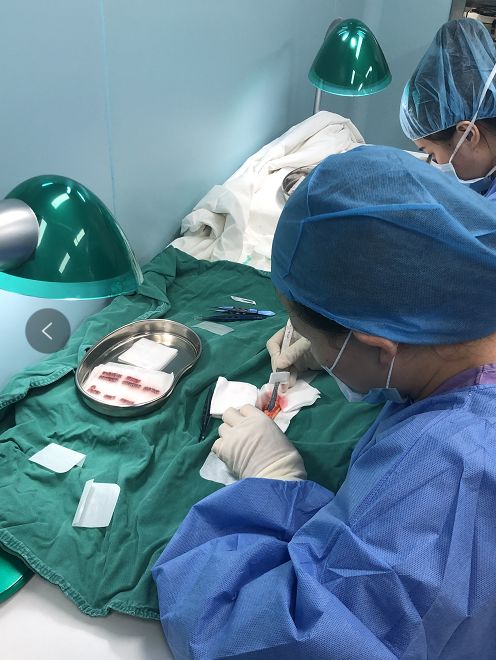 进入手术室,先进行毛囊采集。主治医生1人,护士长1人,护士2人(负责进行分离,提取有效的毛囊,跟采集同步进行),这个过程是脸朝下的,需要调整好卧姿,不然时间久了比较难受。(手术台是头部有个孔的类似油压店的保健床,可升降)1.先分层对采集区域进行消毒,局部注射麻醉(利多卡因+生理盐水+名字没记住),再注射肿胀液,作用是防止伤害到神经系统3.医生使用美国PUE毛囊