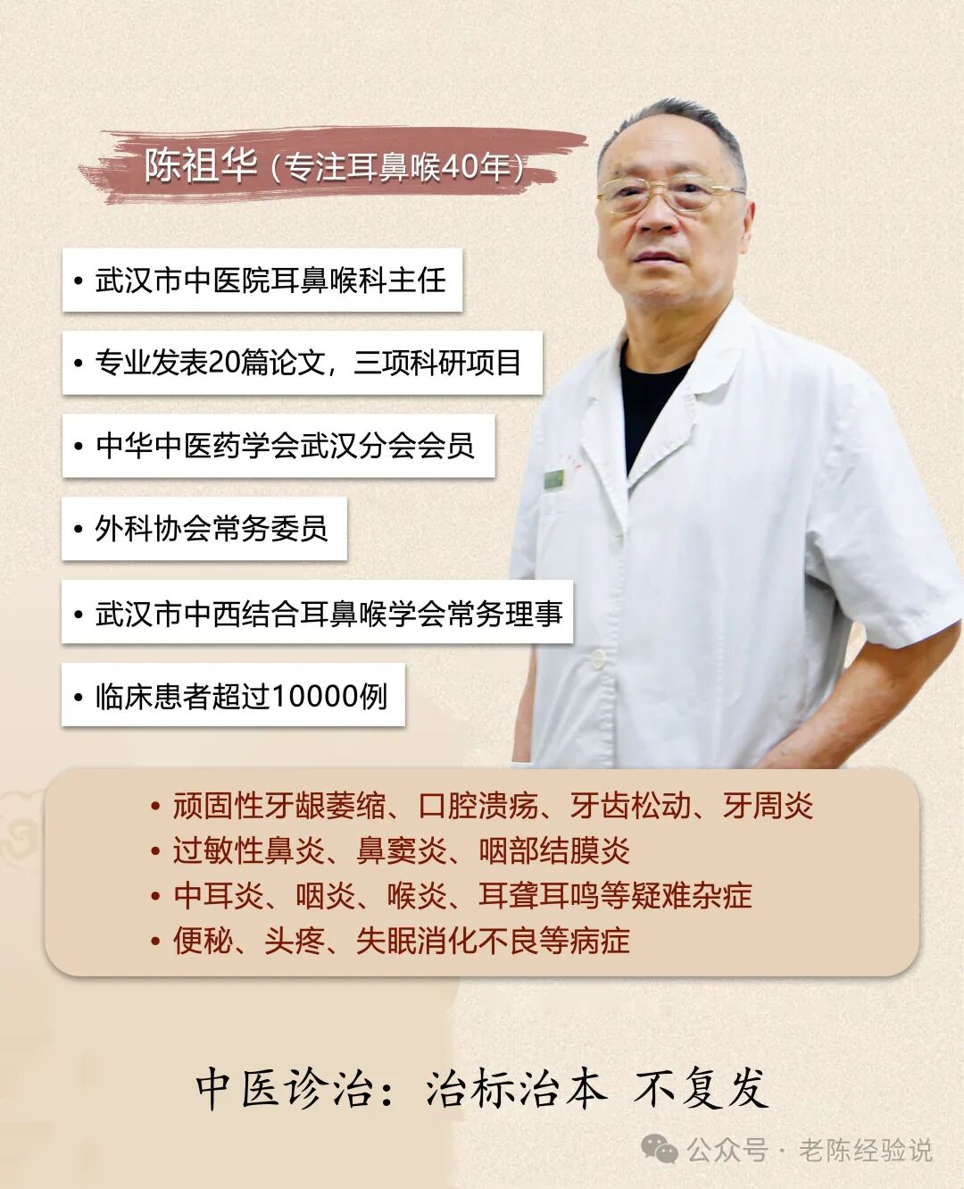 我是陈祖华,是个老中医,不仅仅是在分享中医,也是在用医术治病,在这里我会分享预防鼻炎等病症的小妙招,希望能帮助更多人。