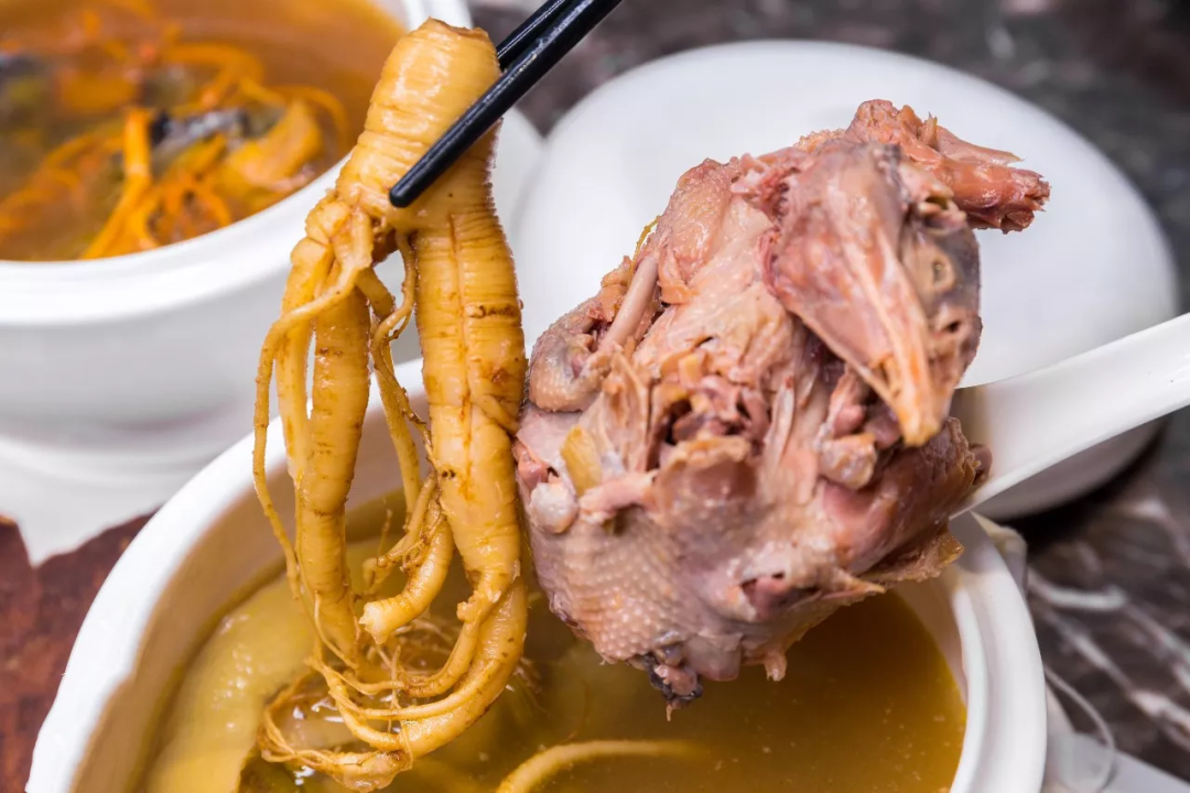 浓郁的香味,金黄澄亮的表皮,油而不腻,鸡味浓郁。嫩滑紧致的鸡肉包裹着香浓的酱料,醇厚鲜香,一整根人参也太壕了 ,滋补又美味!