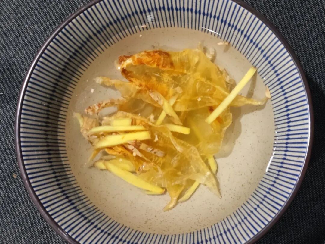1.北海公鱼胶提前用加了姜的清水浸泡变软,鱼油、血丝之类的处理干净。