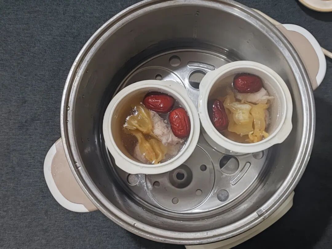 3.将所有食材放入炖盅中,加入开水,炖盅外也注入开水(约1/2的水位即可)。