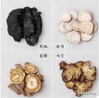 【方解】当归可以减轻妇女经前疼痛、腹胀,对缓解抑郁情绪也有帮助;熟地含有甘露醇、维生素A等成分,能使当归补血活血疗效得到增强;川芎可活血祛风,还富含维生素E;白芍能增强细胞免疫,充盈气血。