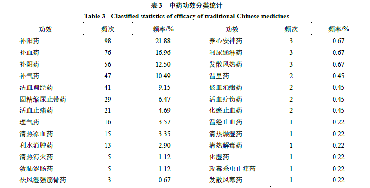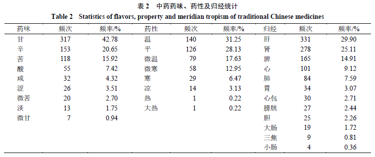 对84味中药进行分析,结果发现,在药味方面,甘、辛、苦位居前3,累计频率为79.35%;在药性方面,以温、平、微温3性为主,累计频率为77.01%;在归经方面,主要归于肝、肾、脾、心、肺经,累计频率为86.63%;在药物功效(参照《中药学》十三五规划教材)方面,补阳药、补血药、补阴药、补气药和活血调经药为常用药(表2、3)。