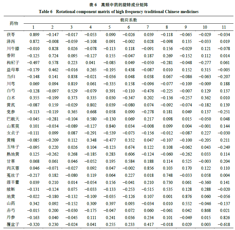 因子分析与关联规则分析、聚类分析都是数据挖掘中常用的统计分析方法,因子分析研究变量之间的内部依赖关系,通过抽象的变量以降维和简化数据。本研究因子分析的结果与聚类分析结果有诸多相似之处,如CF1与I类、CF2与IV类、CF3与VI类、CF4与VII类、CF8与III类大体相同,提示这些相似结果同时具有聚类和因子分析降维的特点。其中CF1可在许多中药处方中找到,如在补肾名方六味地黄丸中作为三泻中的2味佐药以泻肾降浊、渗湿健脾;CF2在清肝止淋汤、大营煎的配伍中出现以补肾利湿、行气活血,CF3在四物汤、当归芍药散中配伍以补血活血,CF4在十全大补汤、归脾汤、并提汤中配伍以补脾肾,CF8中菟丝子平补阴阳,巴戟天和续断补阳益精。可见因子分析结果主要以补脾肾、益气血为治疗方法达到治疗女性生殖相关的疾病。