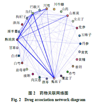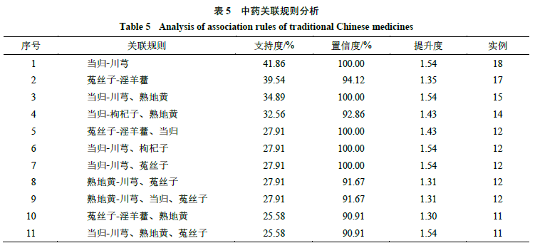 根据药物关联规则分析,得出6种常用药物组合:熟地黄-菟丝子、熟地黄-当归、菟丝子-当归、当归-川芎、当归-枸杞子、菟丝子-淫羊藿。以上可知,熟地黄-菟丝子和菟丝子-淫羊藿为补肾填精药物,熟地黄-当归、菟丝子-当归和当归-枸杞子为补肾养血药物,与当归-川芎行气活血药物强关联。