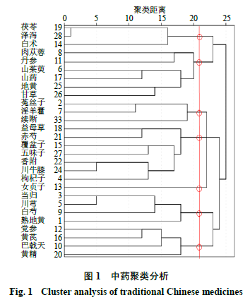 将使用频率≥1%的28味中药运用SPSS Statistics 26.0软件采用平均联接(组间)和Pearson相关性进行系统聚类分析,生成树状聚类图(图1)。在中医理论指导下,以类间距为21,将药物分为7类。Ⅰ类:茯苓、泽泻、白术;Ⅱ类:肉苁蓉、丹参、山茱萸、山药、地黄、甘草;Ⅲ类:菟丝子、淫羊藿、续断;Ⅳ类:益母草、赤芍、覆盆子、五味子、香附、川牛膝、枸杞子;Ⅴ类:女贞子;Ⅵ类:当归、川芎、白芍、熟地黄;Ⅶ类:党参、黄芪、巴戟天、黄精。