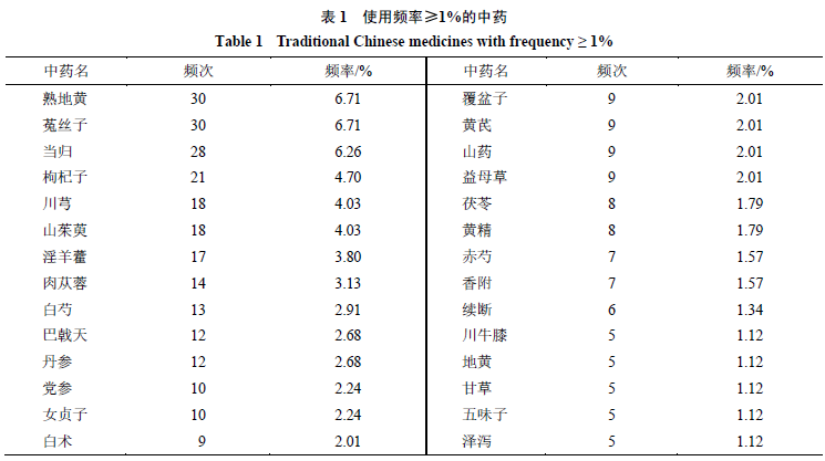 本研究共纳入符合条件的中药处方43个,涉及中药84味,总频次448次。其中使用频率≥1%的中药有熟地黄、菟丝子、当归、枸杞子、川芎等28味(表1),这些中药累计频次340次,占总频次的75.89%。