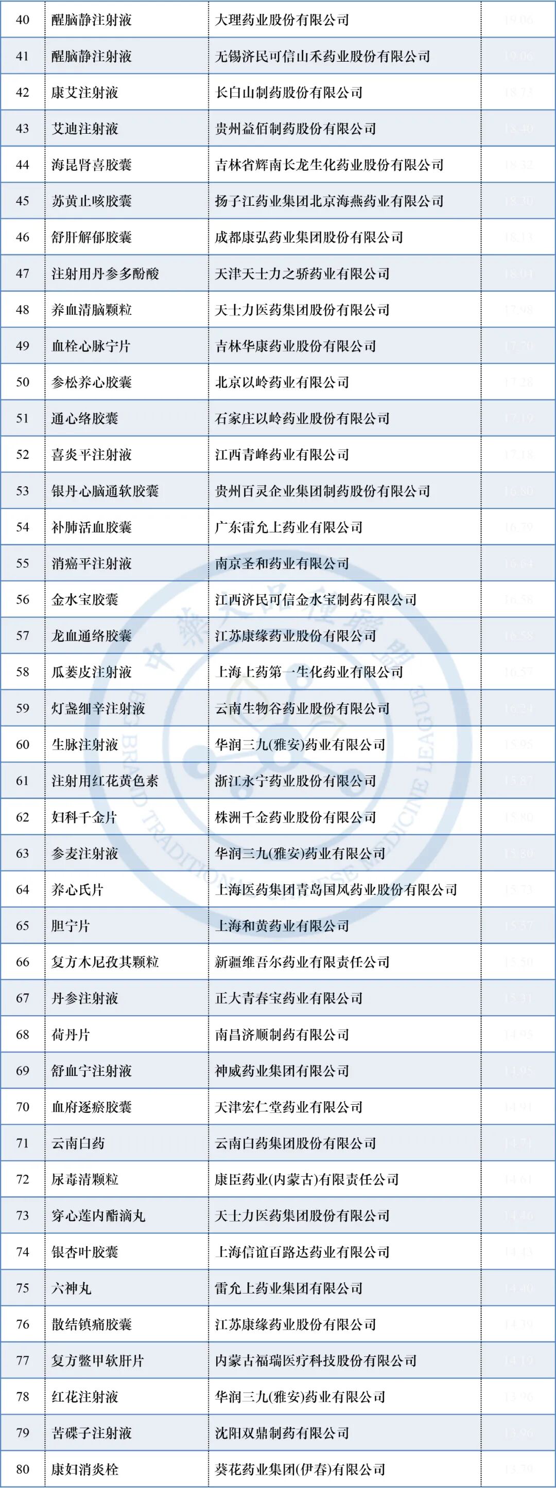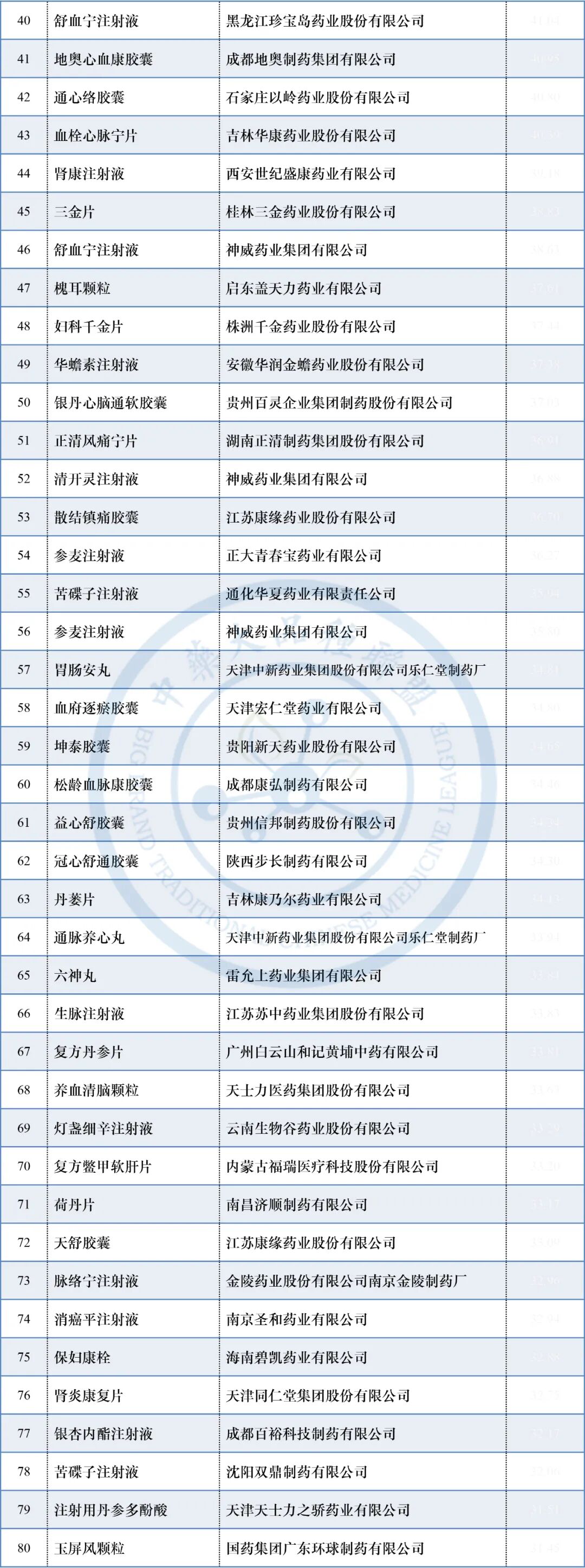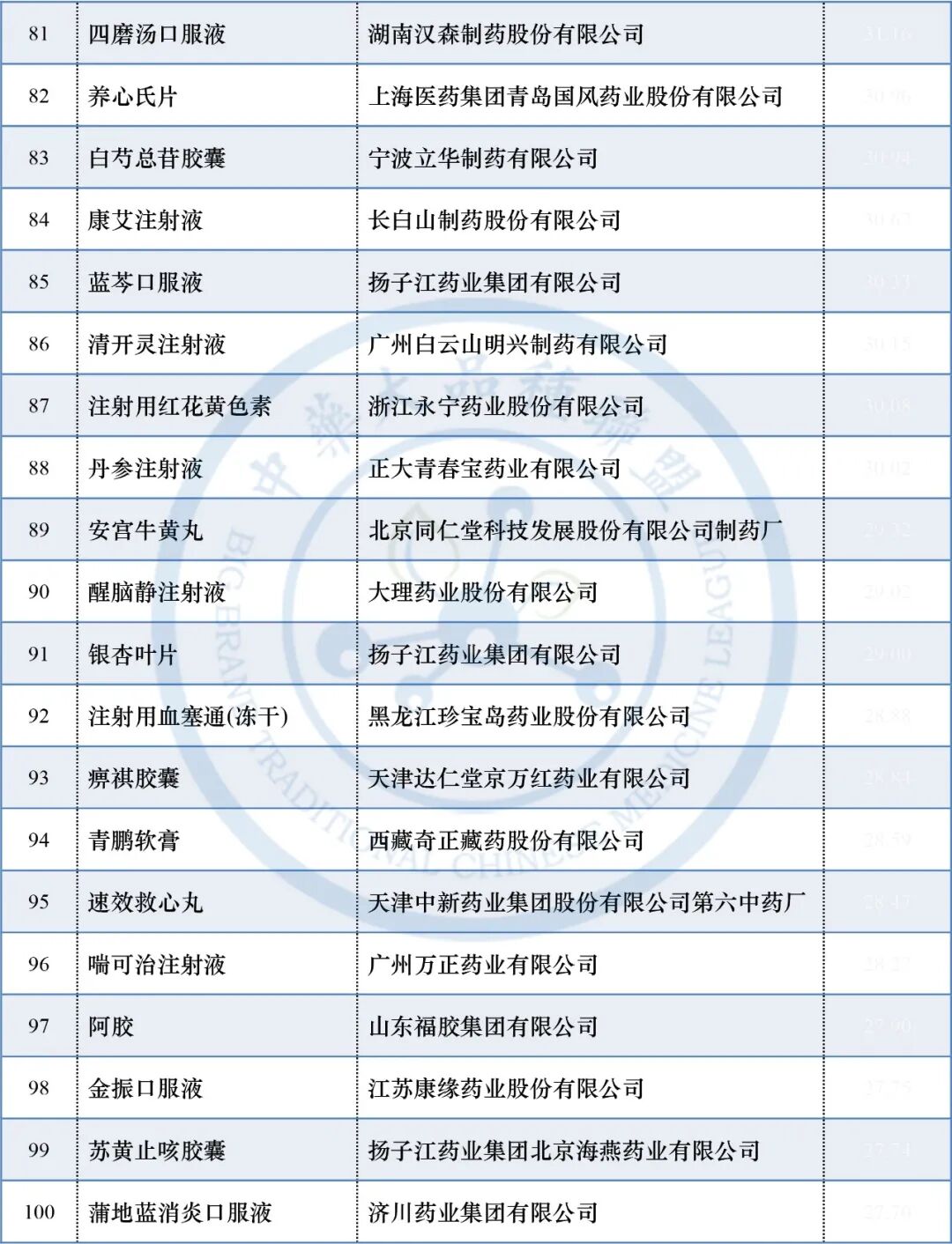科技量值(科技因子)排名前100的中成药大品种(全品类)