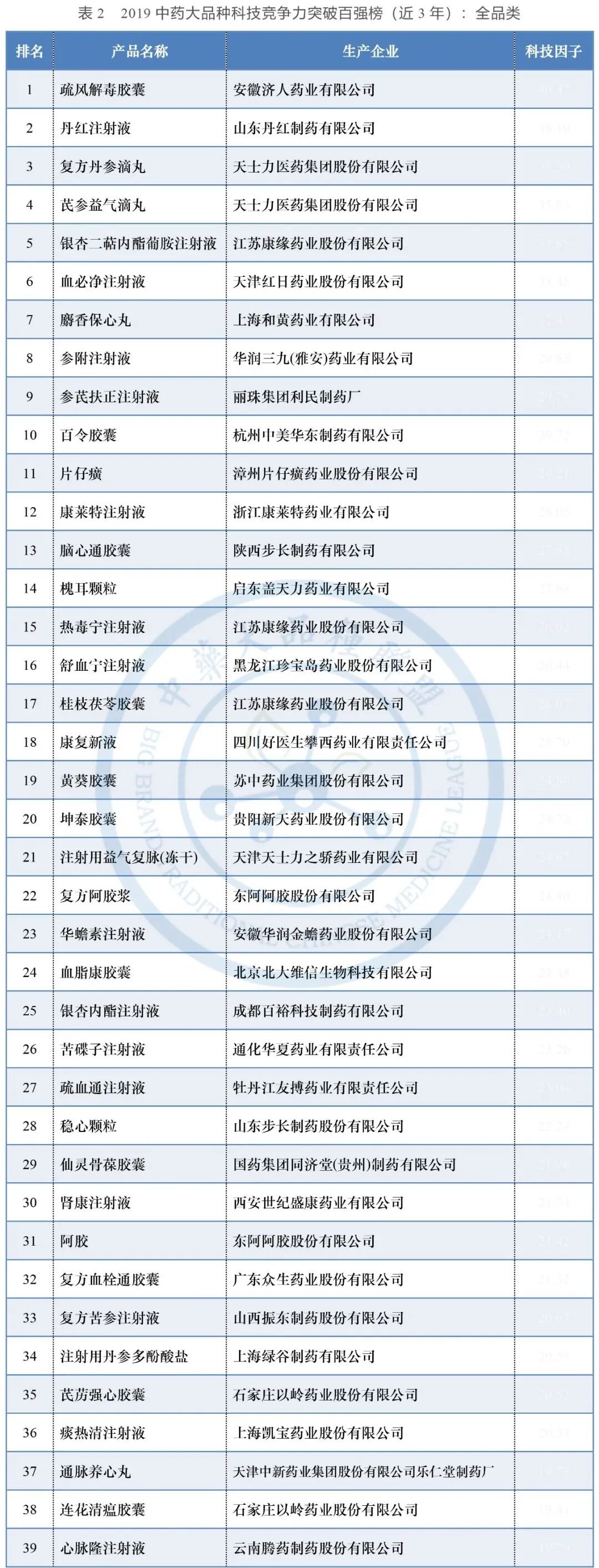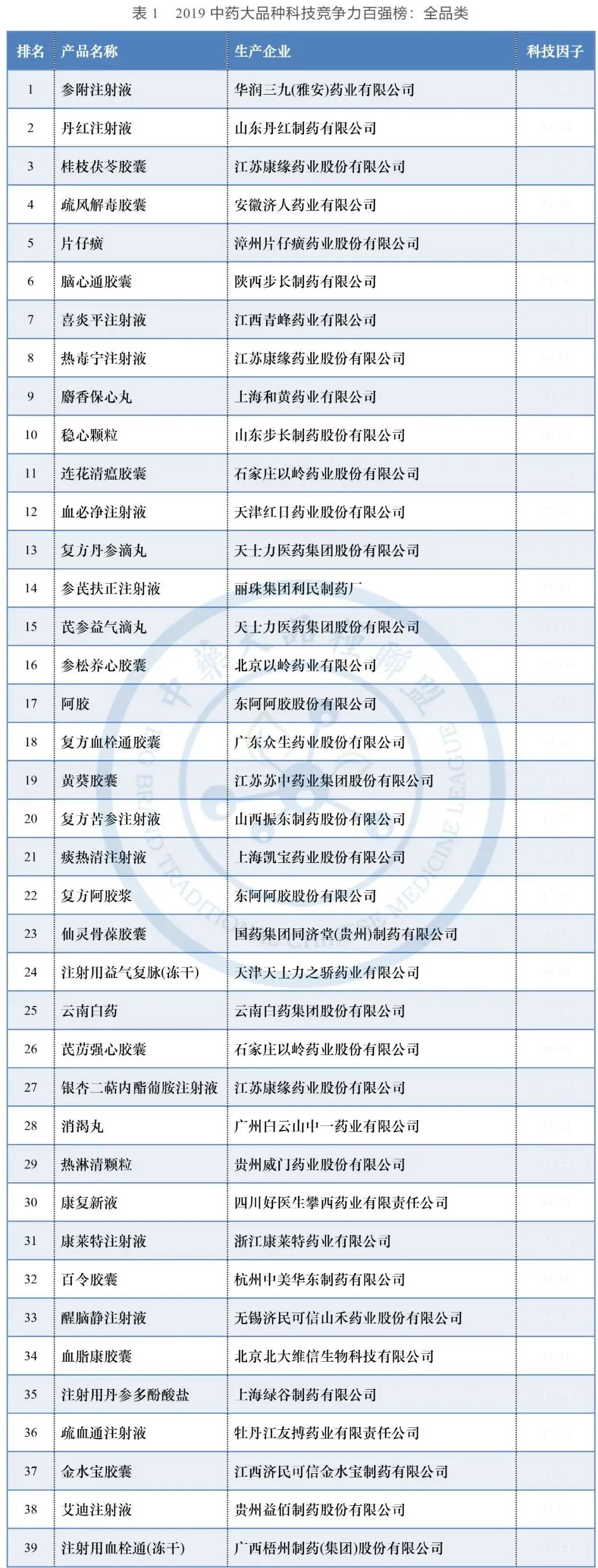 2019入围所有中药大品种中,十年科技因子最高的前100名,如表1所示。