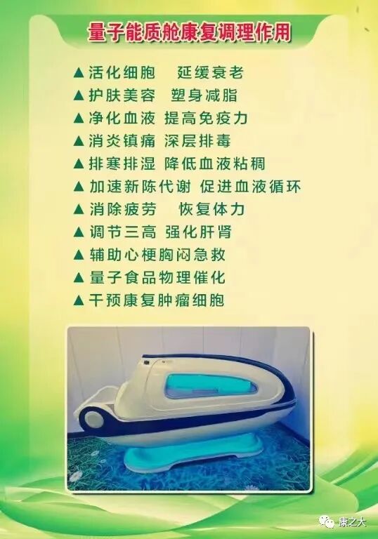 生命能质仓康复调理作用▲活化细胞延缓衰老▲护肤美容塑身减脂▲净化血液提高免疫力▲消炎镇痛深层排毒▲排寒排湿降低血液粘稠▲加速新陈代谢促进血液循环▲消除疲劳恢复体力▲调节三高强化肝肾▲辅助心梗胸闷急救▲量子食品物理催化▲干预康复肿瘤细胞