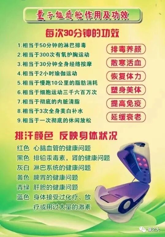 每次30分钟的功效1.相当于50分钟的淋巴排毒2.相当于300次有氧护胸运动3.相当于30分钟全身经络按摩4.相当于2小时瑜伽运动5.相当于慢跑10公里的脂肪消耗6.相当于细胞运动三千六百万次7.相当于彻底的内脏清脂8.相当于3次全身美白补水9.相当于一次彻底的休闲放松排汗颜色反映身体状况1、红色心脑血管的健康问题2、黑色排铅汞毒素,肾的健康问题3、灰白淋巴系统的健康问题4、黄色脾胃的健康问题5、青绿肝胆的健康问题6、蓝色身体接受过化疗、放疗或用过大量的激素排毒养颜,散寒活血!恢复体力,塑身美体!提高免疫,延缓衰老!