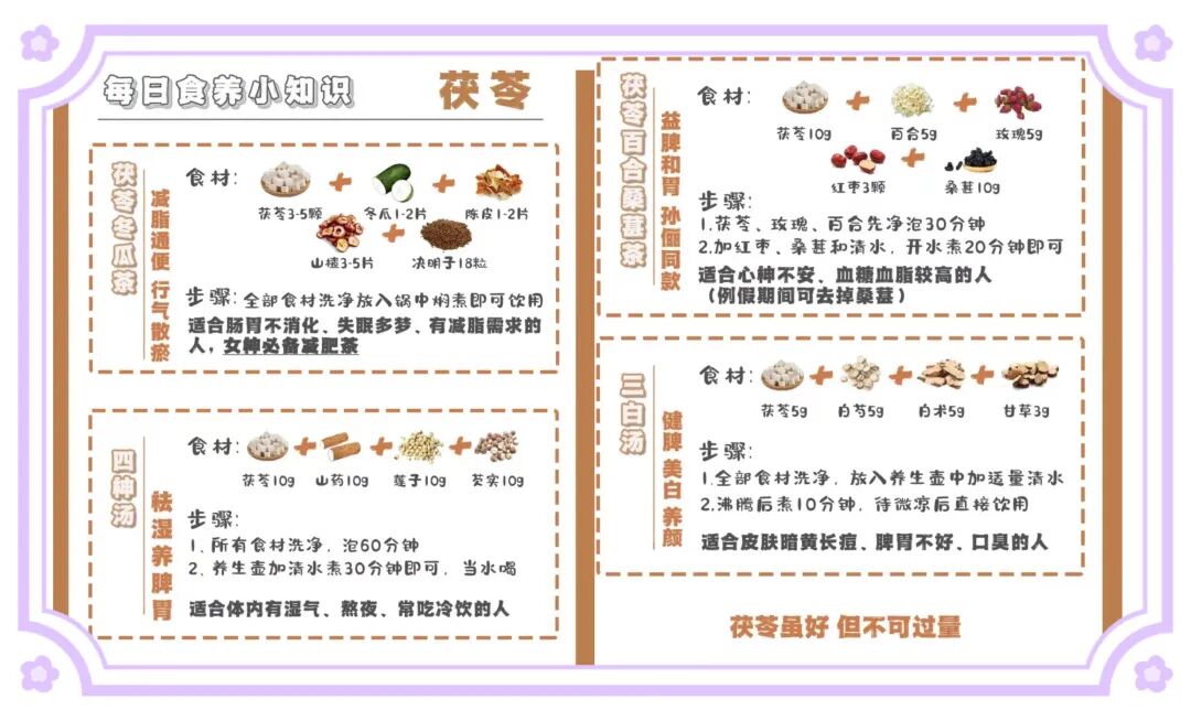 而清代,慈禧太后也常食用茯苓,并命御膳房制茯苓饼赏赐大臣。现如今的人们也将茯苓做成了包括茯苓糕、 茯苓薏米粥、 茯苓排骨汤等花样繁多的养生佳品。