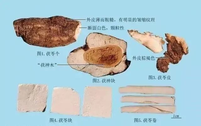 茯苓各部位都可入药,削下的茯苓外皮称茯苓皮;去皮后切制的茯苓称茯苓块;近外皮部淡红色部分称赤茯苓;内层白色部分称白茯苓;切片加工后为茯苓片;茯苓菌核中间天然抱有松根者谓之茯神。