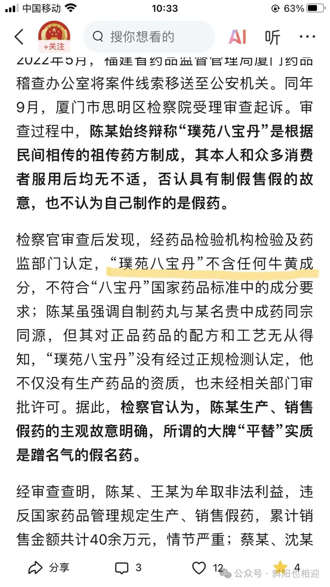1.为了圆自己的谎言,又对璞苑八宝丹的原材料牛黄进行检测,这个检测报告(一审判决书19页23点)更是疑点重重!故意省略胆红素值,而其他四份检测报告都有胆红素值,唯独这一份省略。事出反常必有妖!省略并非仅仅是疏忽大意,而是有意为之,因为检测结果里头的第一句话不具牛黄的性状特征,不具牛黄粉末显微特征,与胆红素对照品的斑点位置和颜色不一致很具有欺骗性。是为了给后面推论埋下伏笔,也就是一审判决书33页开头三行的内容:陈志杰所称的「牛黄」经鉴定不具备牛黄的性状特征,结合其购买「牛黄」的价格、参考相应市场价格及专家意见,可以判定其所购牛黄均非天然牛黄、人工牛黄或体外培育牛黄。