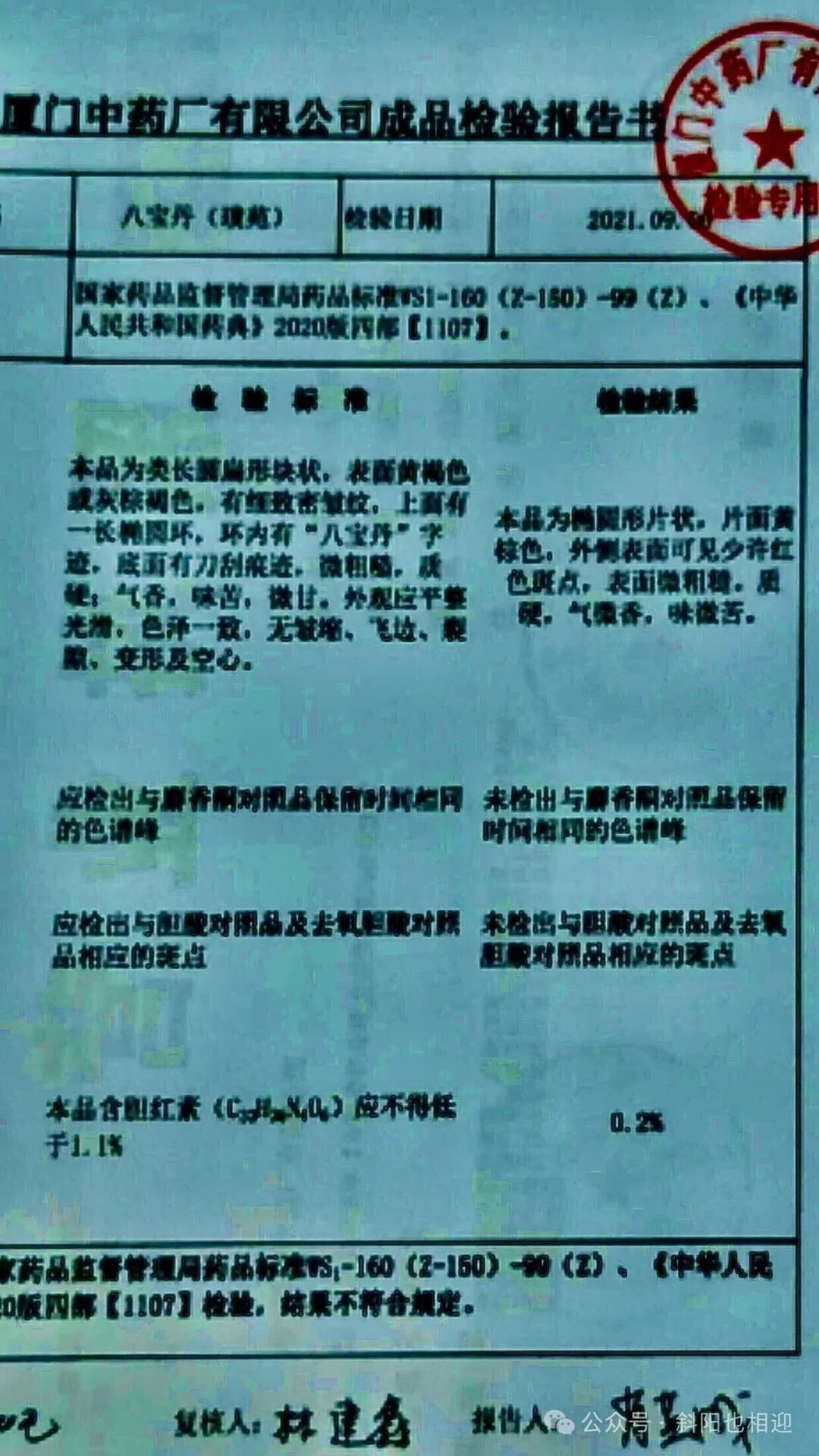 厦门中药厂天天都在做着此类检测,检测报告完整,既有报告人也有复核人,八宝丹的国家标准也是由厂家标准升格而来。反观公诉人找来的检测机构仅仅是偶然从事此类检测,检测报告也不完整,仅有报告人,不符合规范。
