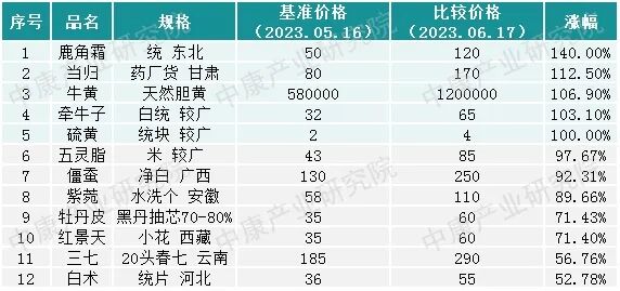 5月16日-6月17日,数据中心监控的2650个品种(包括相同品种、不同品规、不同产地、不同市场)中,上涨品种数370个,占比14%,较上期增加66个,其中5个品种涨幅翻倍(表1)。