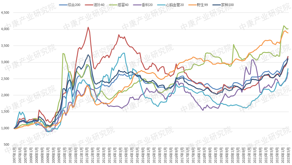 2023年中药材价格涨势迅猛,3月中药材价格综合200指数突破3000点大关,创下历史新高;6月16日收报3544.67点,一个月内上涨超过10%。分品种发现,2023年所有品种都呈加速上涨势头,其中野生品种受稀缺性影响而长期上涨,当前已处于历史最高水平;感冒品种自2012年起启动上涨,23年初受新冠疫情管控放开影响涨势最为明显;心脑血管品种自2020年下半年起也已启动新一轮上涨(图1)。