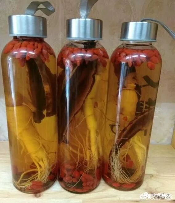 再有鹿茸人参酒。58度白酒,10到15斤,透明玻璃坛20斤装。鲜林下参5到8根,鲜鹿茸300到500克,鲜鹿茸切片不间断,更能与酒融合,达到滋补效果,两者搭配,可治阳虚不足,补气血,壮元阳,治湿气,增免疫,调理阳痿早泄,女子宫寒,体力不支等。也是每天30到40毫升。