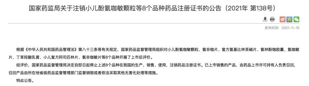 国家药监局亦于 2021 年 11月 16日将小儿酚氨咖敏颗粒、小儿复方阿司匹林片、氨非咖敏片等 8 个「复方感冒药」注销。