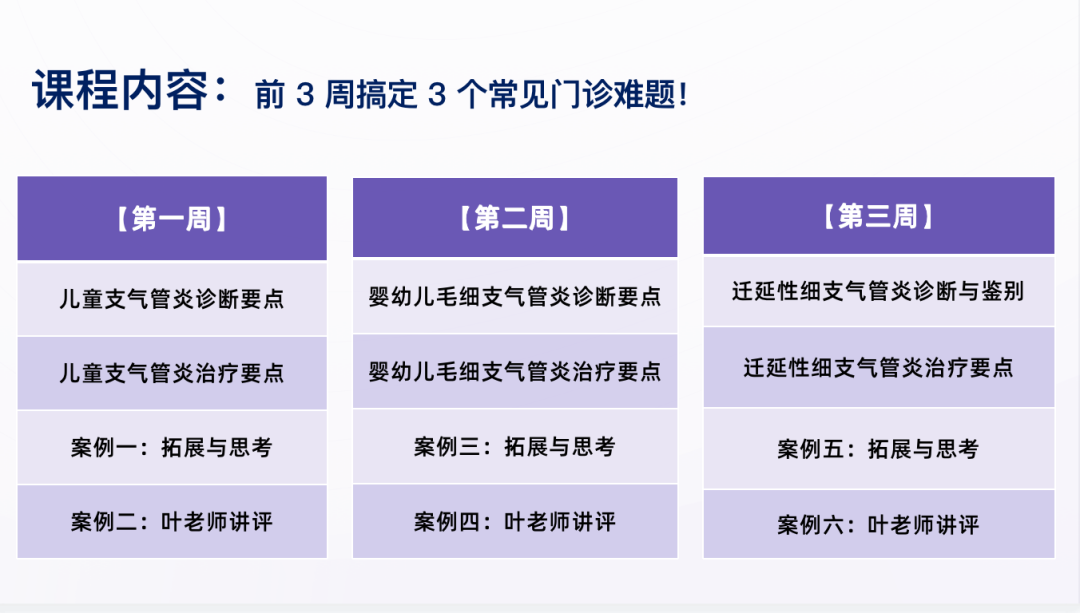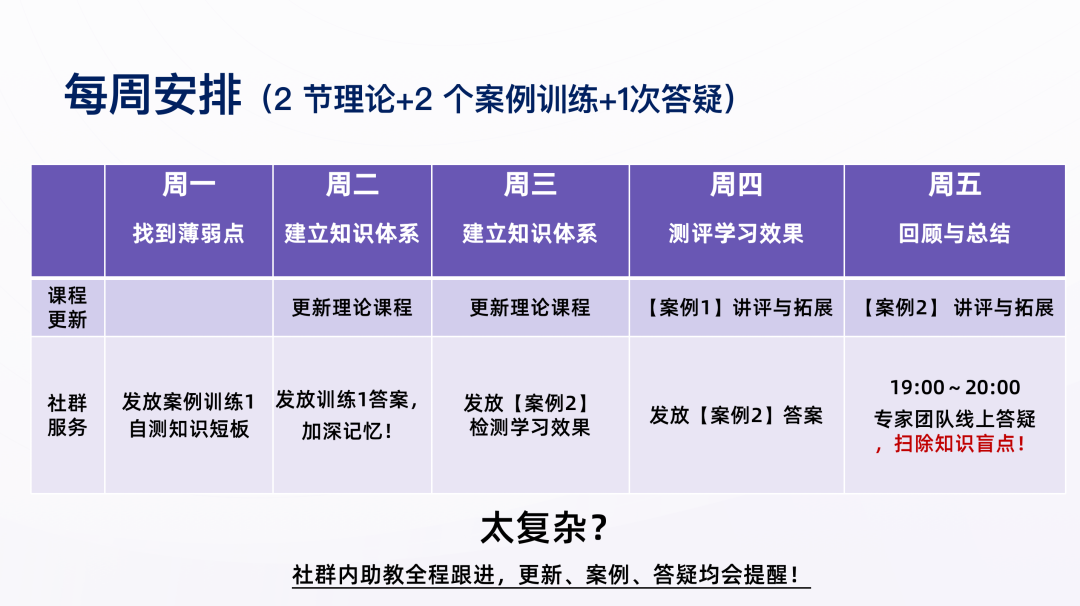 此次课程通过 6 周精讲精练,2 + 2 + 1 模式(每周 2 节理论精讲 + 2 次精选案例训练 + 1 次专家团队社群定时答疑),三位一体保证学习效果!