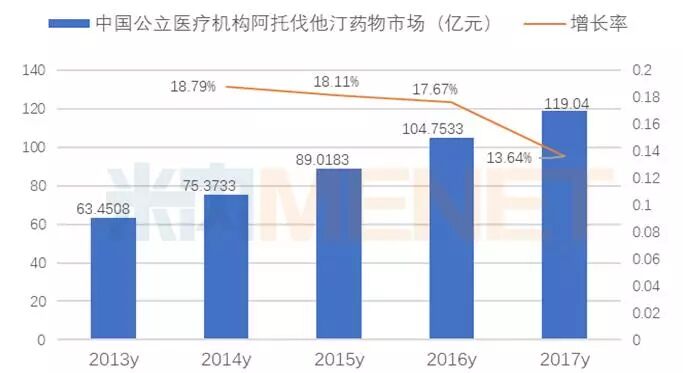 据米内网数据显示,2017年中国公立医疗机构阿托伐他汀钙制剂终端销售额达到了119.04亿元,同比上一年增长了13.64%。辉瑞占56.73%,北京嘉林占23.08%,天方药业占16.66%,乐普药业占2.15%,广州百科占1.37%。目前国内总体市场近160亿市场容量。